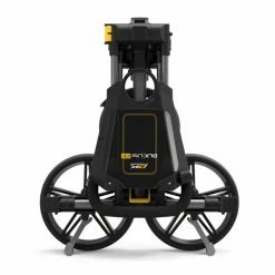 Featuring a large scorecard holder, drinks holder, umbrella holder base, storage compartment, ball holder, tee holder and parking brakes on both wheels to secure the trolley in place when not in use.